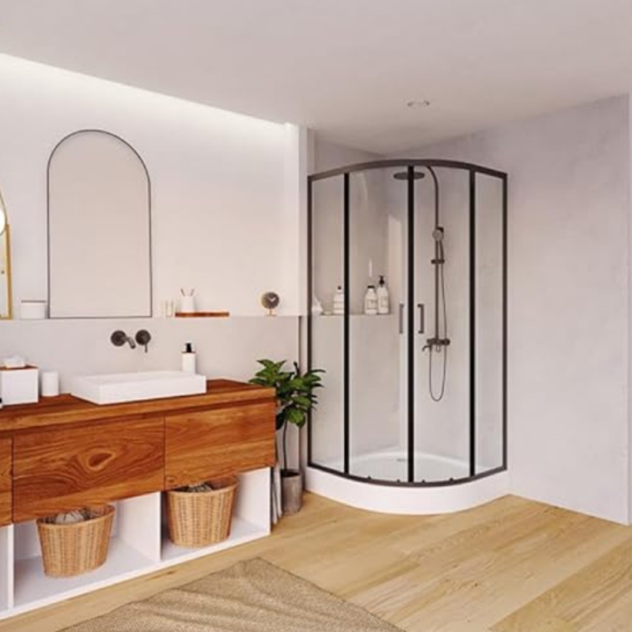 La cabina de ducha SHOWER CURVO está diseñada para maximizar el espacio de tu baño gracias a su formato curvo y dimensiones de 90 x 90 cm. Su altura de 200 cm garantiza comodidad incluso para usuarios más altos. El marco negro aporta un toque de elegancia contemporánea, haciendo que esta cabina se convierta en el centro de atención de tu baño.